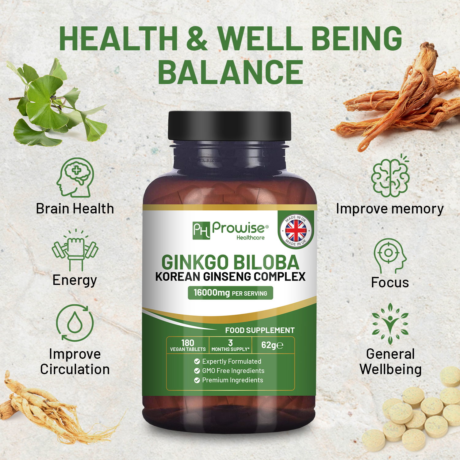 - POTENT STRENGTH: Prowise Ginkgo Biloba and Korean Ginseng 16000mg per serving contribute to normal psychological function as well as to normal functioning of the nervous system. This Ideal combination of Ginkgo Biloba and Korean Ginseng help to maintain cognitive function and mental performance.
