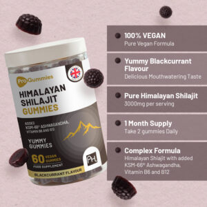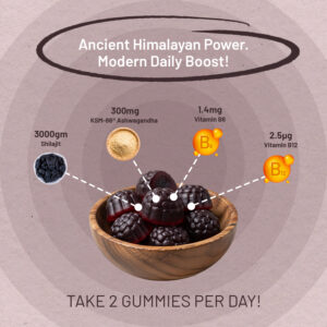 INGREDIENTS: Shilajit Extract (50% Fulvic Acid), Acidity Regulators (Citric Acid, Trisodium Citrate), Glucose Syrup, Sugar, Water, Gelling Agent (Pectin), Colouring Food (Black Carrot Extract), Flavouring, KSM-66® Ashwagandha Root Extract, Pyridoxine Hydrochloride, Cyanocobalamin.