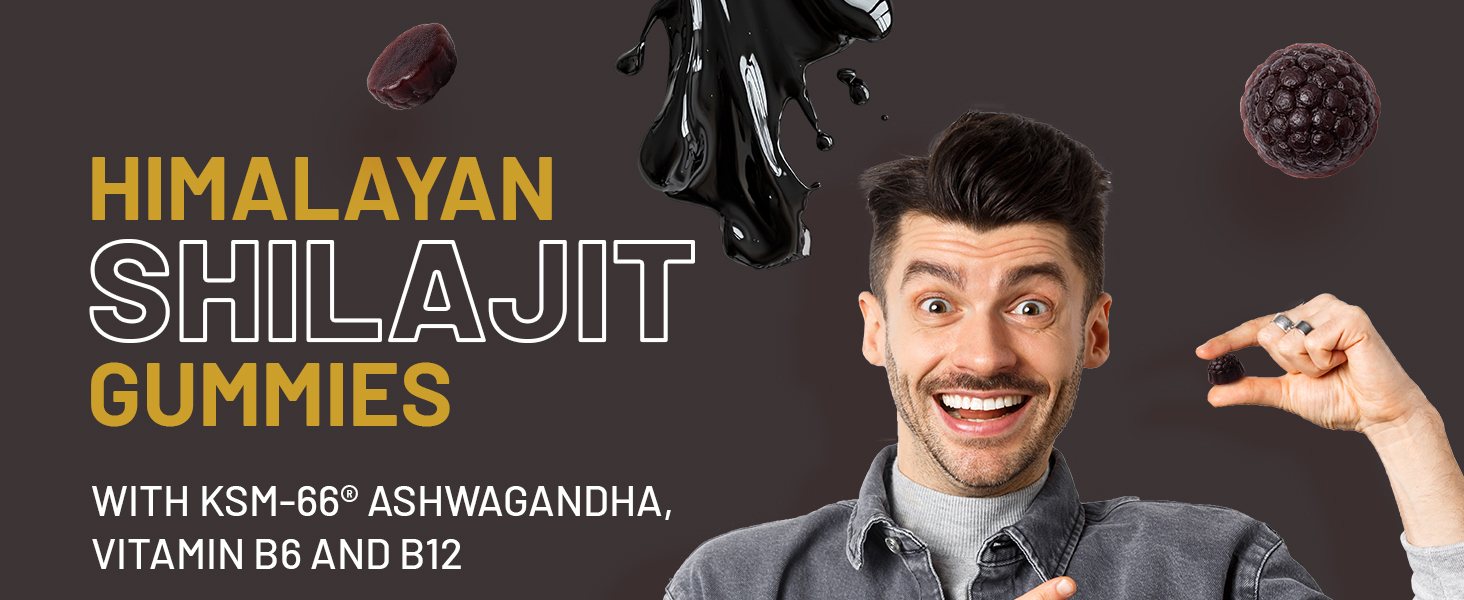 INGREDIENTS: Shilajit Extract (50% Fulvic Acid), Acidity Regulators (Citric Acid, Trisodium Citrate), Glucose Syrup, Sugar, Water, Gelling Agent (Pectin), Colouring Food (Black Carrot Extract), Flavouring, KSM-66® Ashwagandha Root Extract, Pyridoxine Hydrochloride, Cyanocobalamin.