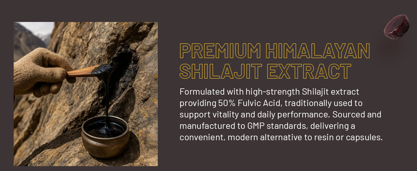 PREMIUM HIMALAYAN SHILAJIT EXTRACT: Formulated with high-strength Shilajit extract providing 50% Fulvic Acid, traditionally used to support vitality and daily performance. Sourced and manufactured to GMP standards, delivering a convenient, modern alternative to resin or capsules.