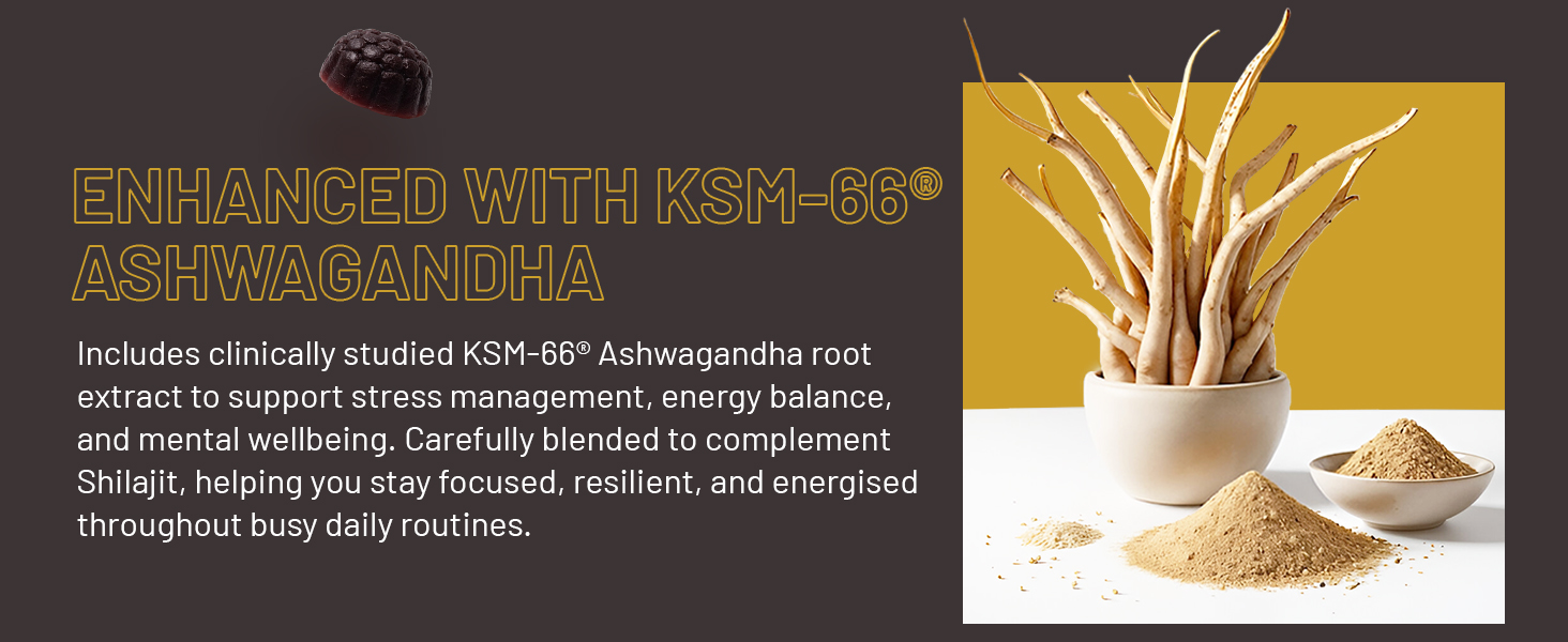 ENHANCED WITH KSM-66® ASHWAGANDHA: Includes clinically studied KSM-66® Ashwagandha root extract to support stress management, energy balance, and mental wellbeing. Carefully blended to complement Shilajit, helping you stay focused, resilient, and energised throughout busy daily routines.