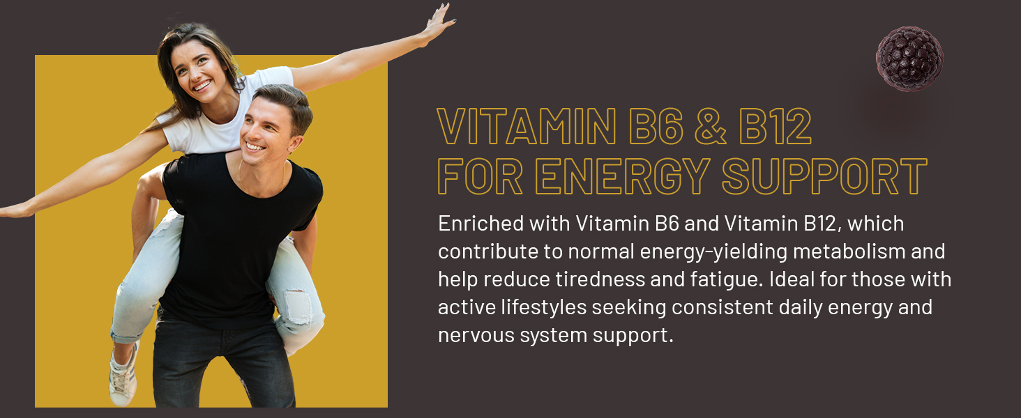 VITAMIN B6 & B12 FOR ENERGY SUPPORT: Enriched with Vitamin B6 and Vitamin B12, which contribute to normal energy-yielding metabolism and help reduce tiredness and fatigue. Ideal for those with active lifestyles seeking consistent daily energy and nervous system support.