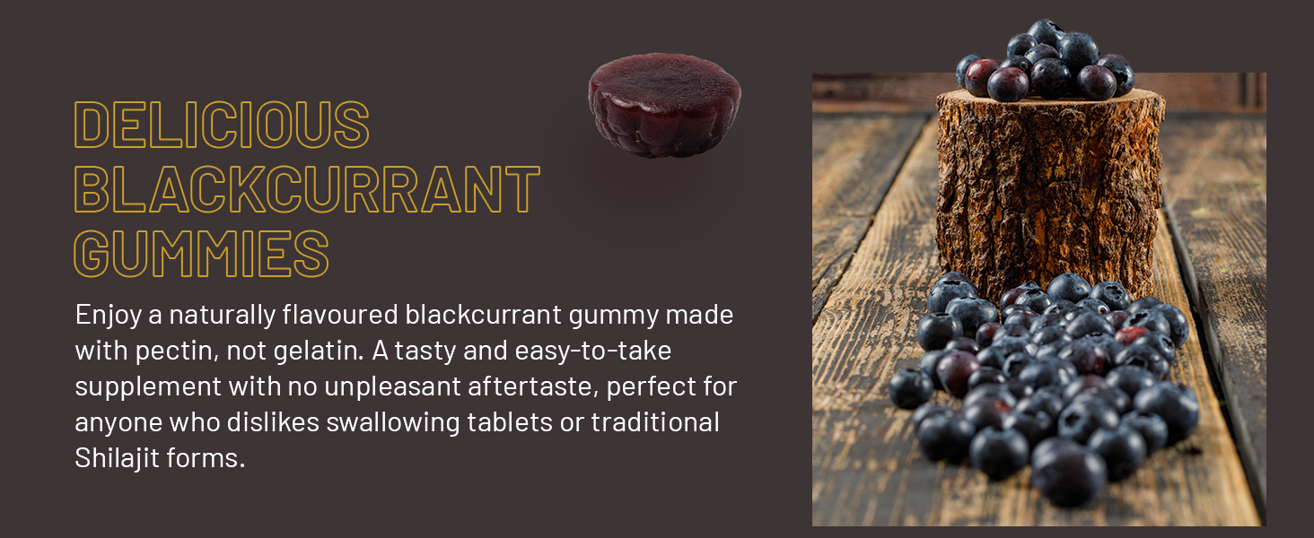 DELICIOUS BLACKCURRANT GUMMIES: Enjoy a naturally flavoured blackcurrant gummy made with pectin, not gelatin. A tasty and easy-to-take supplement with no unpleasant aftertaste, perfect for anyone who dislikes swallowing tablets or traditional Shilajit forms.