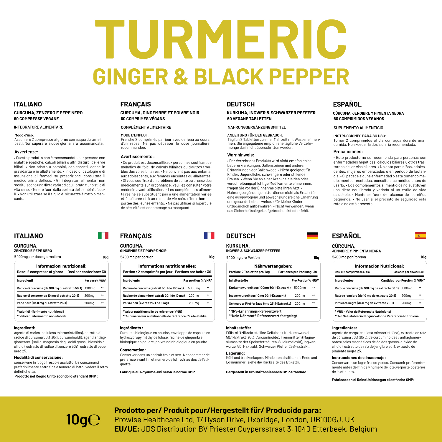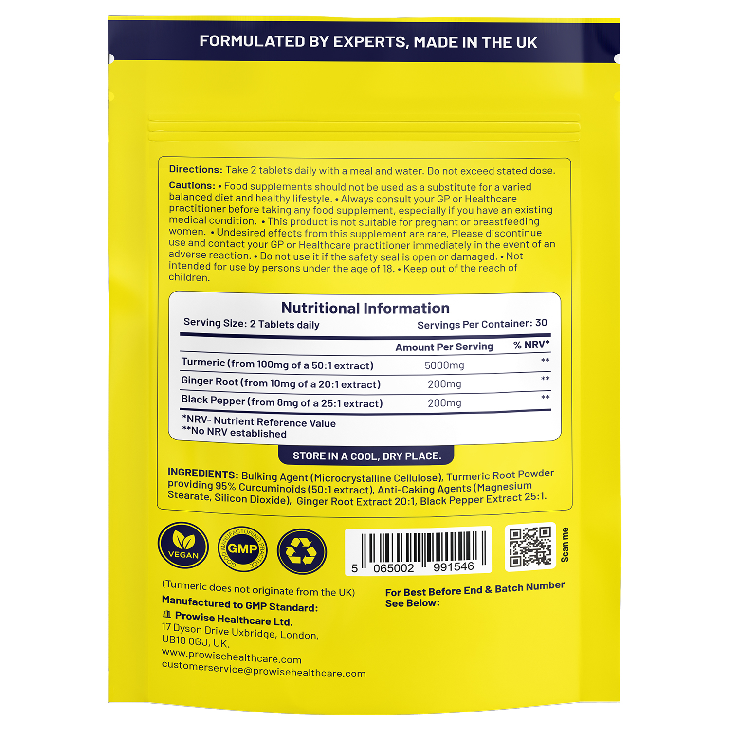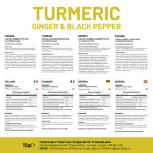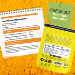 INGREDIENTS: Bulking Agent (Microcrystalline Cellulose), Turmeric Root Powder providing 95% Curcuminoids (50:1 extract), Anti-Caking Agents (Magnesium Stearate, Silicon Dioxide), Ginger Root Extract 20:1, Black Pepper Extract 25:1.