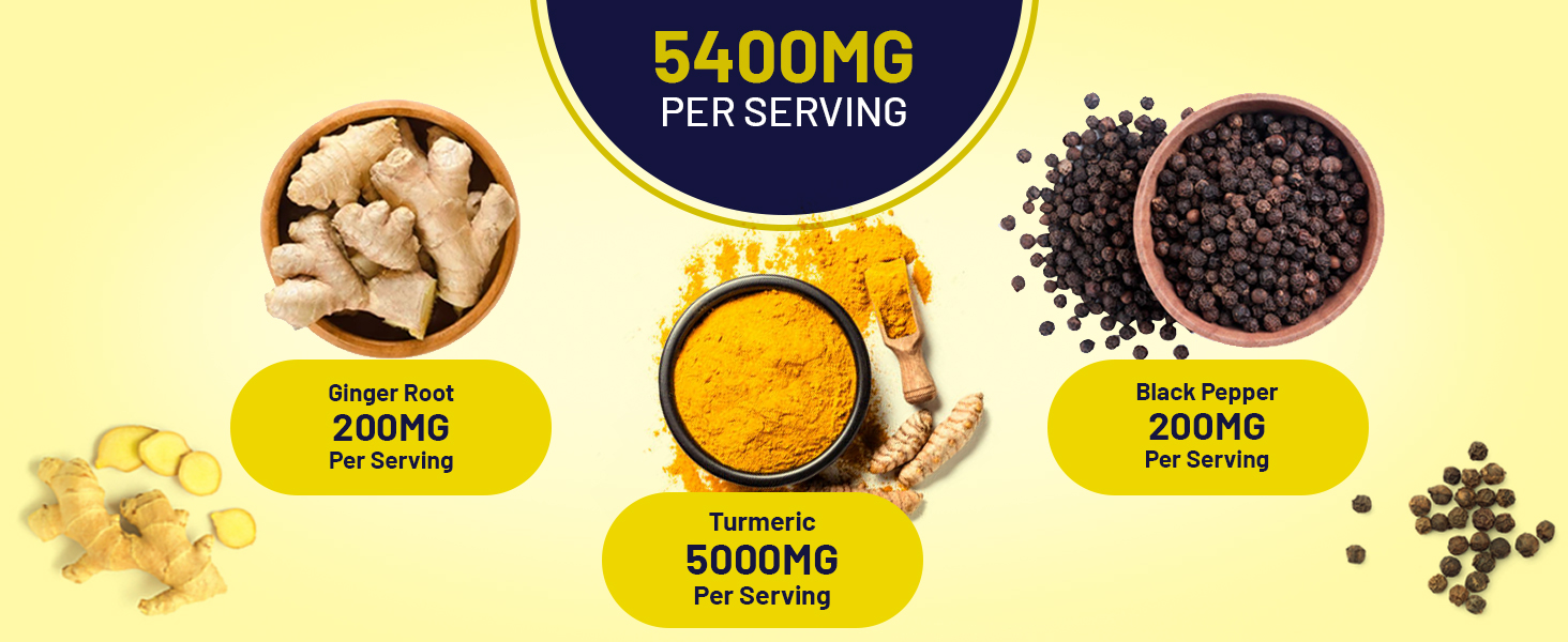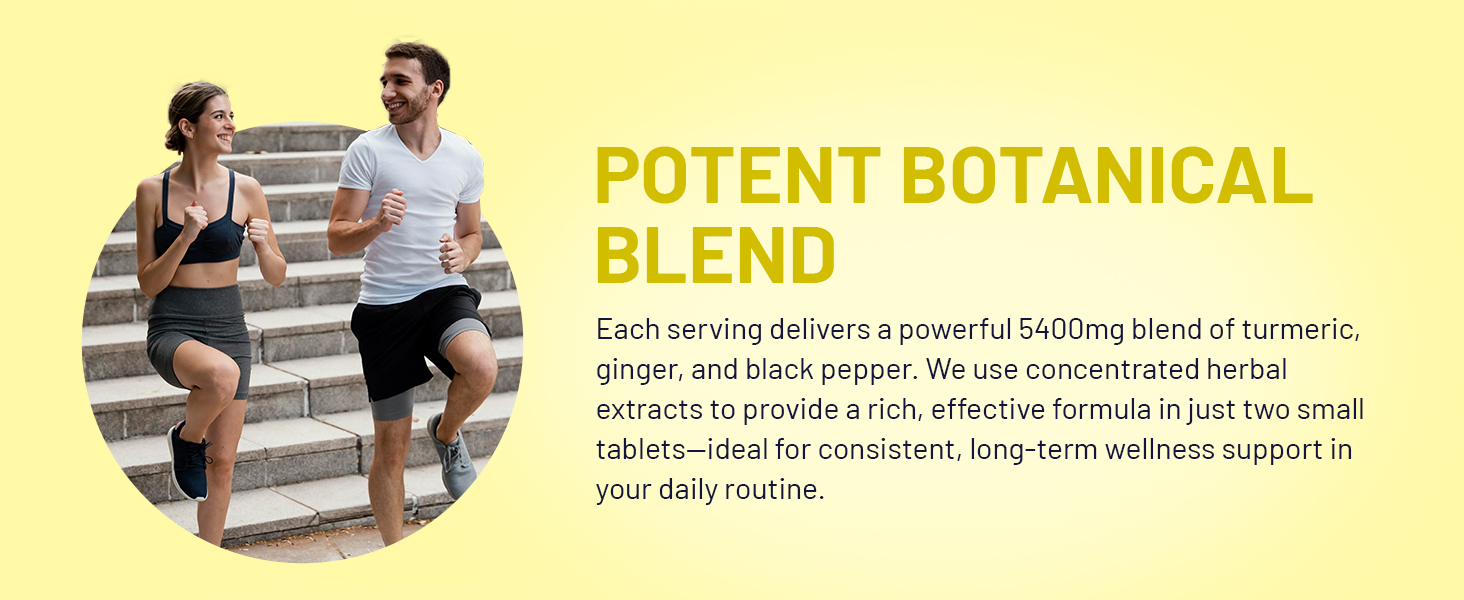 POTENT BOTANICAL BLEND: Each serving provides an impressive 5400mg blend of turmeric, ginger, and black pepper. Using concentrated herbal extracts, we deliver a powerful formula in just two small tablets—perfect for convenient, long-term support as part of your daily wellness routine.
