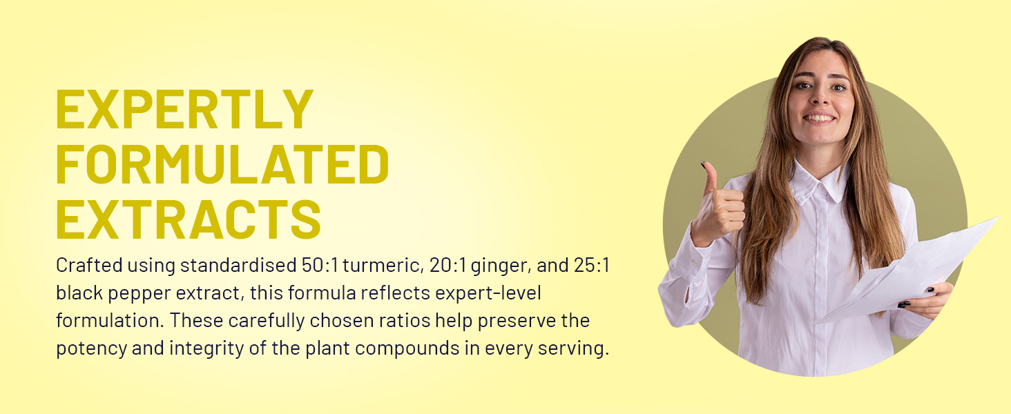 EXPERTLY STANDARDISED EXTRACTS: Formulated with premium 50:1 turmeric, 20:1 ginger, and 25:1 black pepper extracts, this supplement reflects expert formulation. These carefully balanced ratios help maintain the strength and integrity of key plant compounds in every serving.